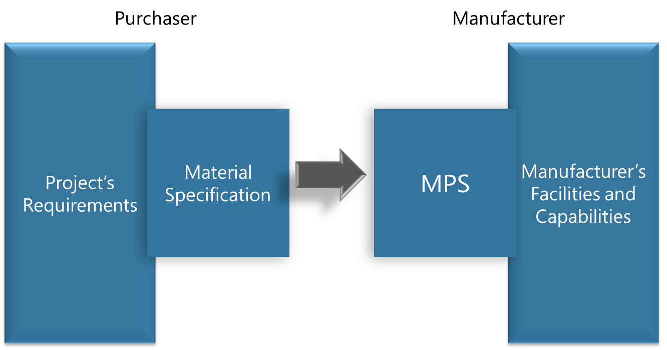 Figure 1 illustrates a notional procurement framework for material products such as steel plates, pipe, forgings, castings, fasteners, induction bends, etc.  The Material Specification is tightly coupled to the Project Requirements.  However, it is necessarily loosely coupled to manufacturing since it is used for tendering and must be relevant to multiple manufacturers.  The MPS improves the interface between the Purchaser and Manufacturer by documenting a description of how the manufacturer will satisfy the specified requirements.  Drafted by the manufacturer, the MPS lists and explains every principal step in manufacturing.  Each step includes the measurable parameters (i.e., essential variables) that impact the properties, quality, consistency, and acceptability of the final product and the acceptance range of each.  This enables the MPS to serve as the basis for qualifying the manufacturing procedure and developing the Inspection and Test Plan (ITP), as illustrated in Figure 2.